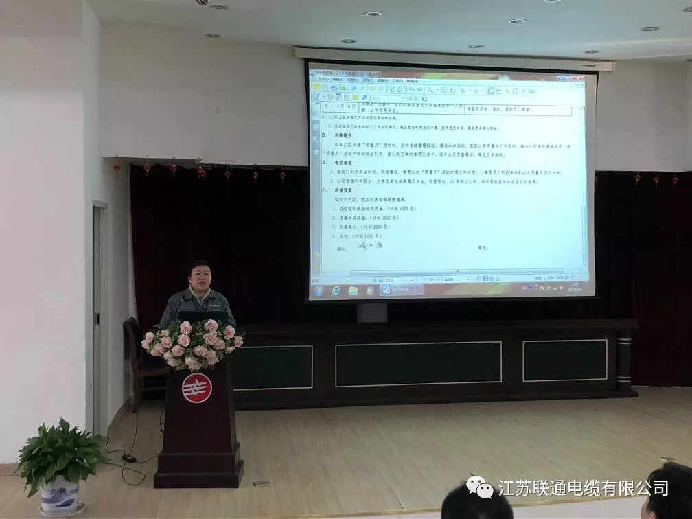 春节已过,正月未完,联通电缆历年的三月“质量月”活动已经全面开展。9日,江苏联通电缆有限公司所有同仁齐聚一堂,开启了引领全年生产管理质量的”质量月”活动。为了进一步提升公司的品牌形象,增强企业产品的核心竞争力,使公司数据电缆、安防电缆、特种电缆、新能源汽车电缆在激烈的市场竞争中占领市场。紧紧围绕“我们的执着从每一个细节开始”做好各项管理工作,努力从营销、技术研发、采购、生产、检验、交付、售后等全过程提升质量水平,更好满足顾客需求,江苏联通电缆有限公司特开展 2018 年“质量月”活动。